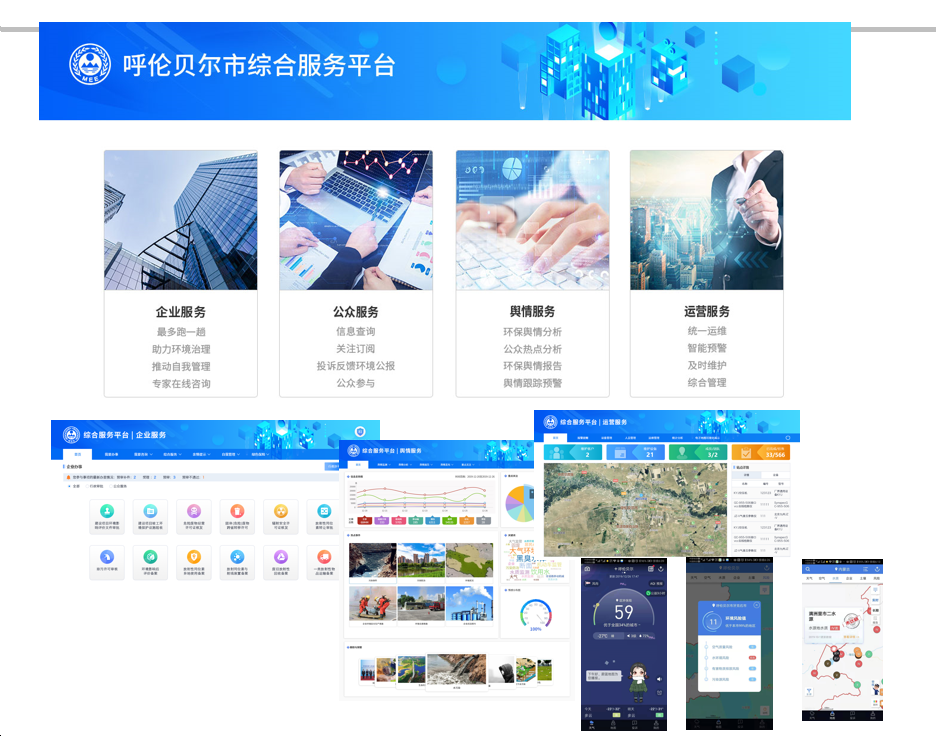 针对公众、企业、环保管理部门等不同的用户群体给予全方位的服务,包括公众服务系统、企业服务系统、舆情服务系统、运营服务系统以及综合服务门户等内容。